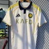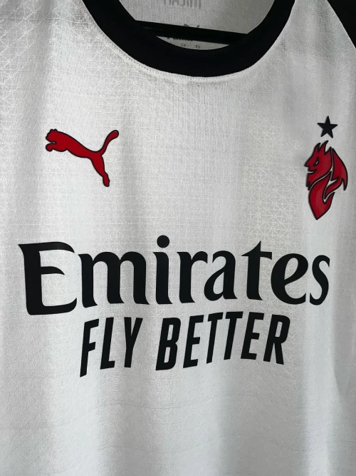 The AC Milan 25/26 away kit is a classic white jersey featuring the club’s iconic “Diavoletto” (little devil) emblem from the 1980s, accented with fiery red and black details.