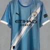 The Arsenal adidas 25/26 Away Shirt features a dark navy blue base with a vibrant royal blue lightning bolt graphic, a design that pays homage to the popular 1995-96 away kit.