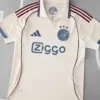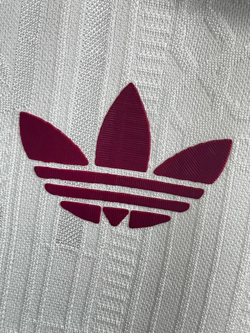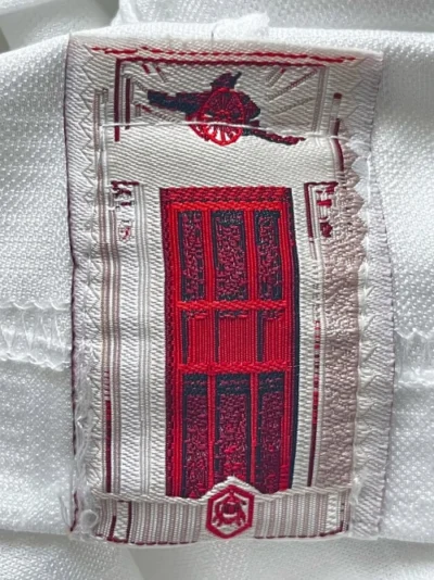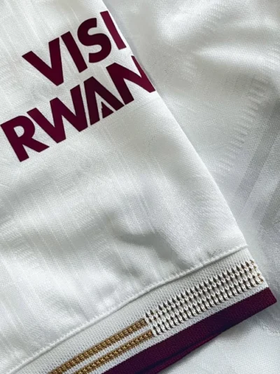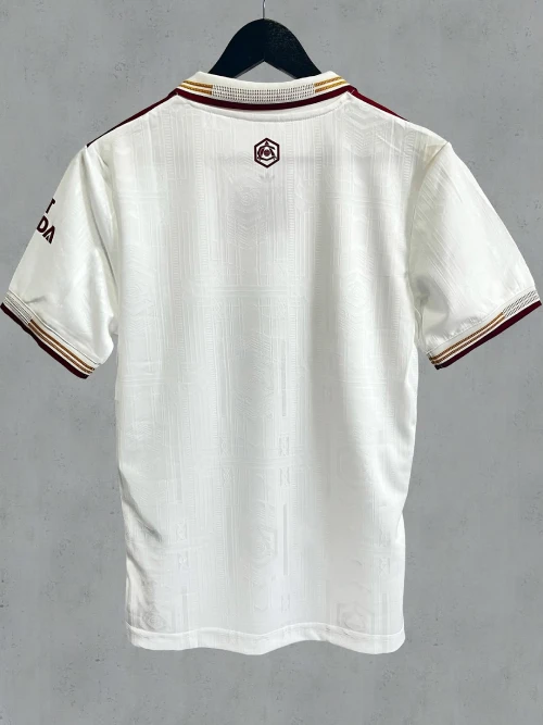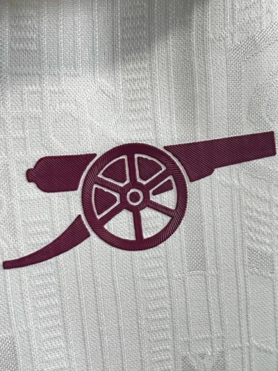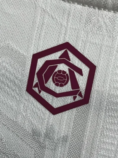 The Arsenal 25/26 season third kit is a white shirt with maroon and gold accents that pays tribute to the club’s final season at Highbury stadium by featuring graphics inspired by its art deco architecture. The kit includes a classic polo collar, and its design is similar to the 2007-09 alternate kit, with maroon logos and gold and maroon striped detailing on the collar and sleeve cuffs.
