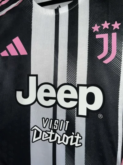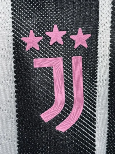 The Juventus 25/26 home kit, designed by Adidas, blends the iconic black and white stripes with timeless pink details as a nod to the club’s founding colors. The kit was officially unveiled on May 14, 2025.