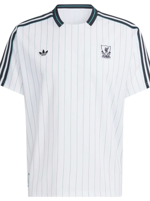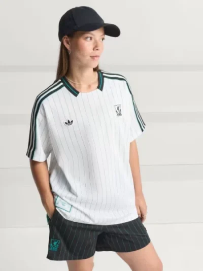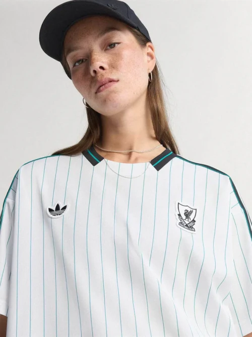 The white and sea green pinstriped top is part of the Adidas “Icons” collection, which draws inspiration from 1980s football fashion.