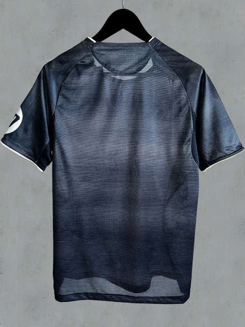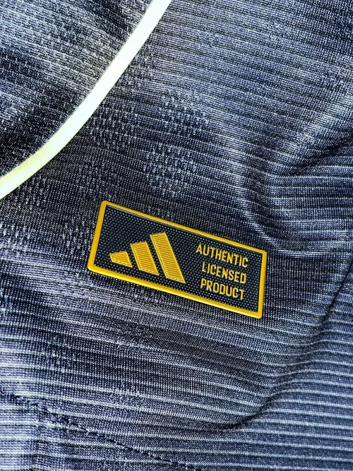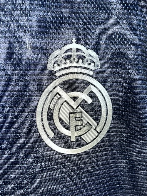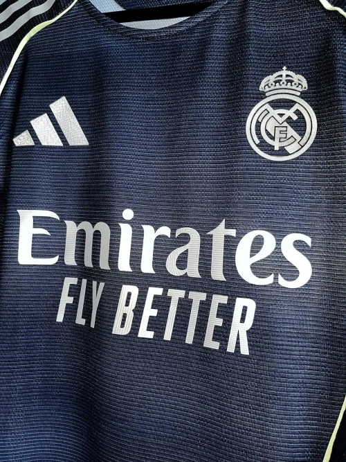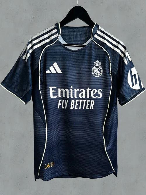 The Real Madrid 2025/2026 away kit, created by Adidas, is a dark navy blue design with silver and green accents. It is inspired by the renovated Santiago Bernabéu stadium at night and was officially released on June 16, 2025.